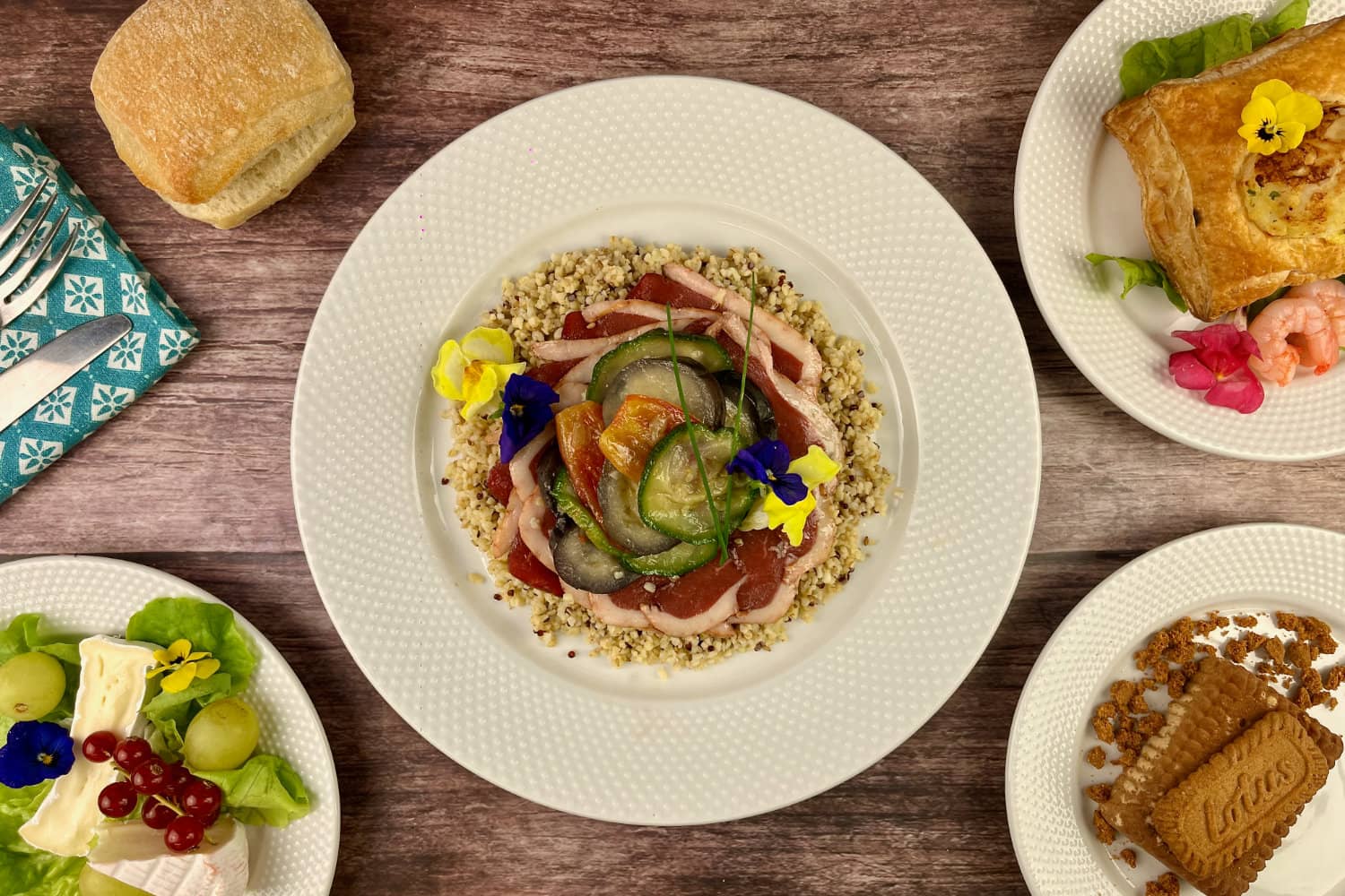 Plat (à déguster froid) : Salade de quinoa, boulgour & sésame, accompagnée d’un tian de légumes grillés (aubergines, courgettes, tomates et oignons rissolés) servie avec du magret de canard fumé et sa délicate sauce au miel.
