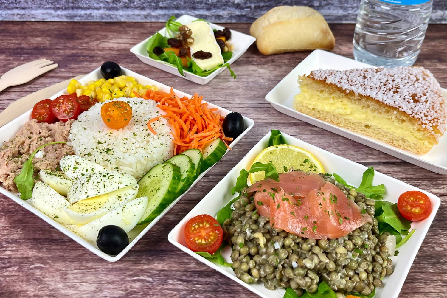 Plat (à déguster froid) : Riz basmati, thon listao, carotte râpée, concombre, oeuf, maïs, tomates cerise, olives noires, roquette.