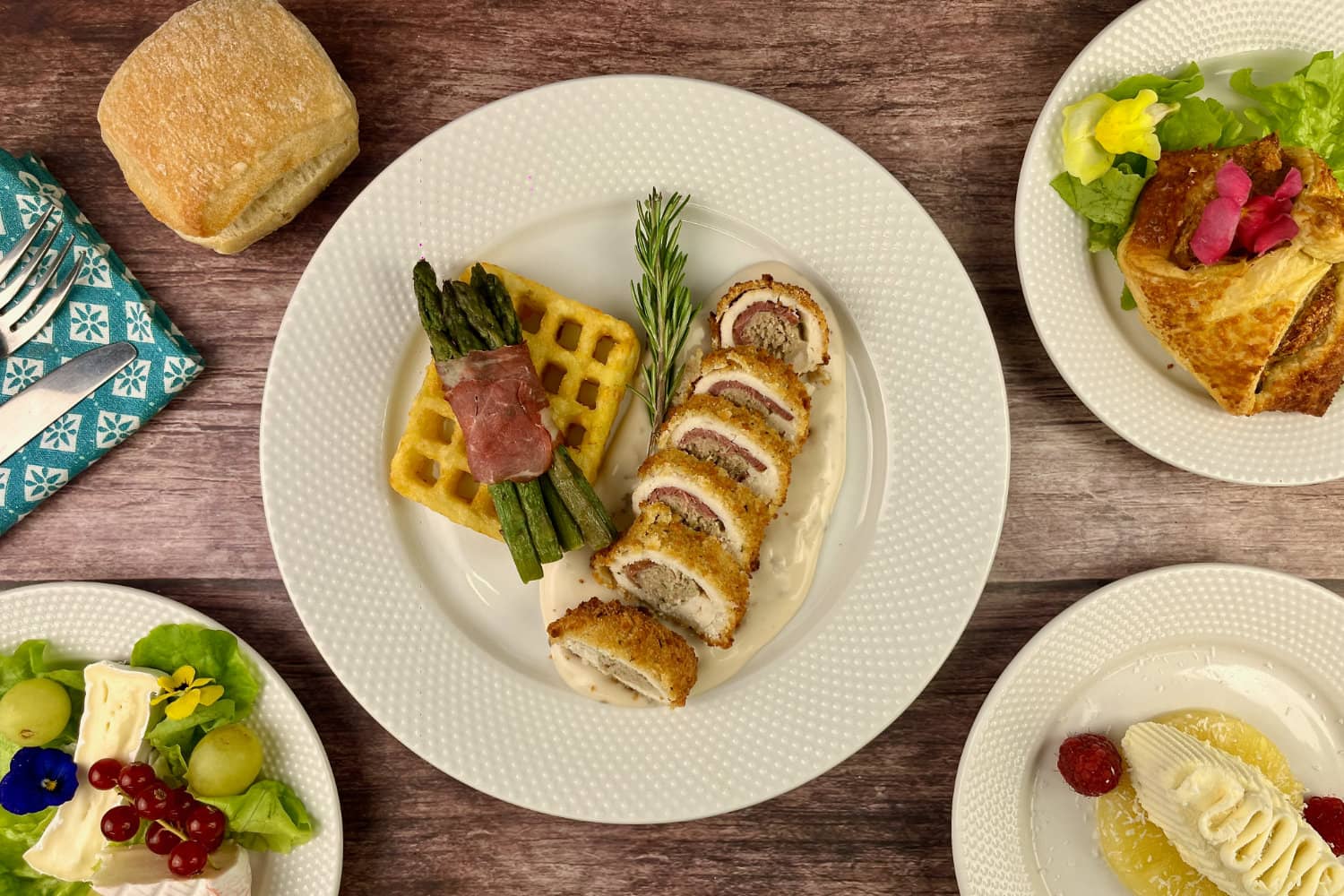Plat (à déguster chaud) : Rösti de pomme de terre, roulé de poulet crème champignons et bacon de dinde fumé, fagot d’asperges lardé.